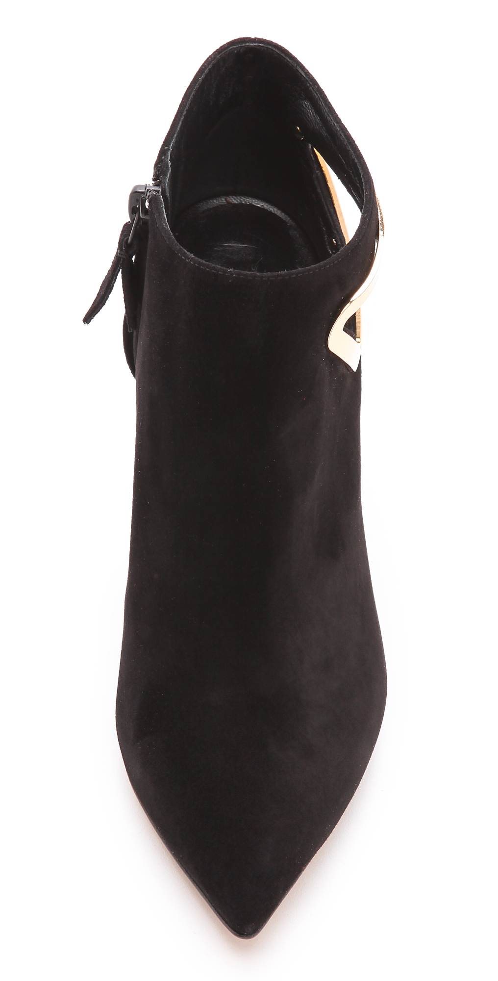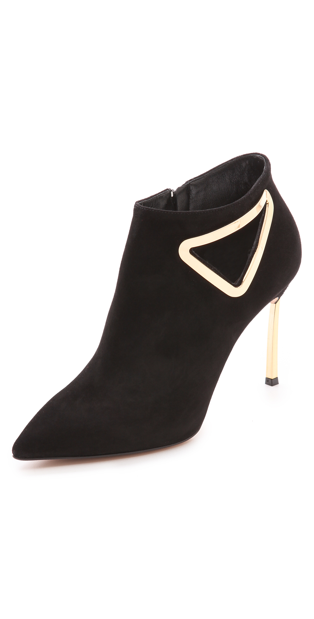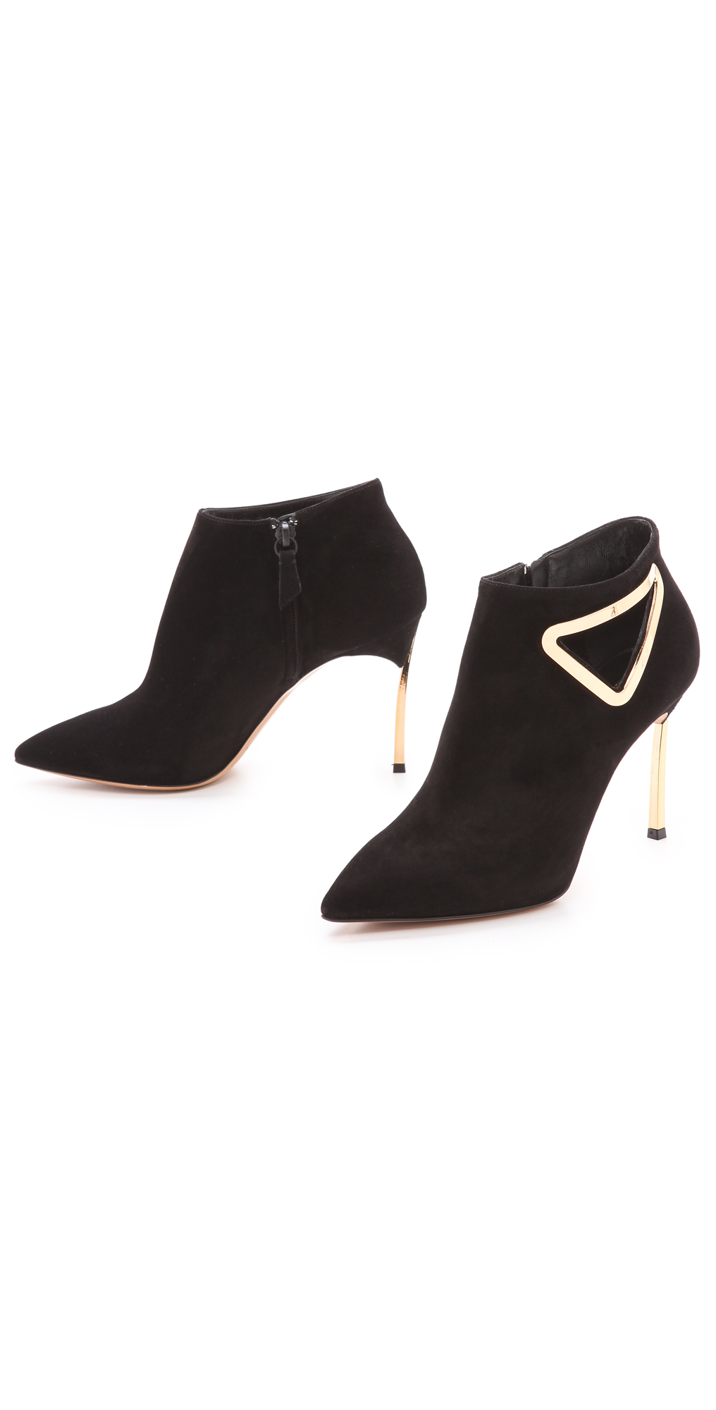 Elegantan zlatni ton stavlja upečatljiv rub na ovim Casadei čizmama. Šiljati prsti. Oblikovana visoka potpetica. Skriveno unutrašnje kopčanje.