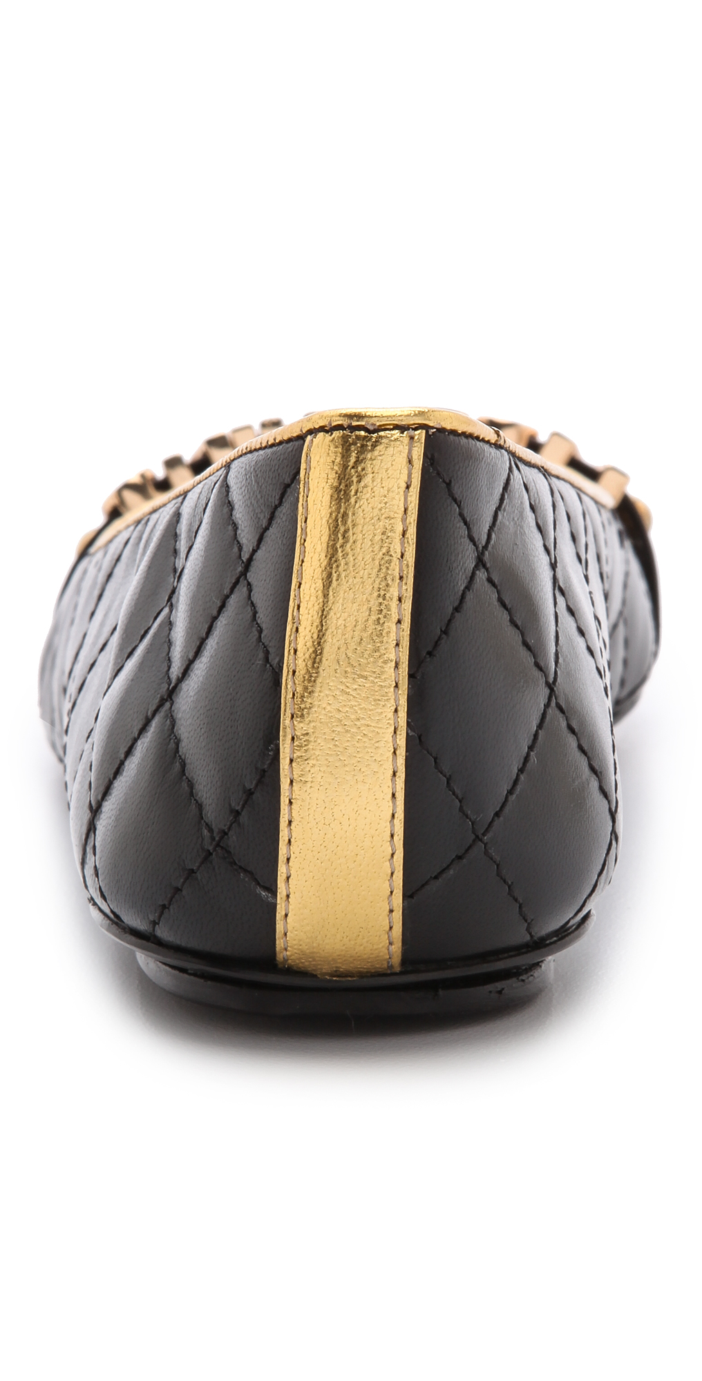 Ako još niste do kraja upotpunili svoj ljetni mozaik obućom idealno je vrijeme da ga upotpunite s ovim modernim cipelama.Sjajna crno zlatna kombinacija ravnih cipela tzv. popularnih balerinki koji su godinama trend među mladima pa čak i starijima. Izgrađene su od prošivene crne kože, Sjajna metalna ploča u zlatnom tonu kao i ispolirani sjajni logo potpis naglašavaju vrh cipele. Slične modele možete naći u Zari, H&M koji prati sve modne trendove u različitim nijansama.